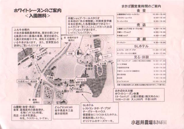 さて、この旅のメインイベント、子羊ミルクタイム! 時間にはじわじわと人も増え、30人くらいは居たでしょうか。お姉さんの説明によると今年は子育て上手なお母さんが多かったので、授乳しなければいけない子羊が少ないのだそうです。で、5頭。なので、なるべく多くの人にミルクをあげて欲しいので交代しながらやって下さいとのこと。その時、哺乳瓶を口から外さないまま交代するように。柵の外に出された5頭は大きさがいろいろだったけど、皆1ヶ月半くらいなのだそうです。押されるというより引っ張られるという形で無事授乳できました。そのあと、だっこして記念写真撮ったり。大きさの割に軽い。やっぱりふわふわの毛のせいでしょうか。ミルクタイムが終わるとさーっと人がいなくなってしまった。それで、ジンギスカン食べてるんだよ。私たちは、そんなこと、でけまへん。なので、山麓館で期間限定“まきばの春待ち膳(1500円)”を頂きました。ほんのり温かい農場素材の二色ごはん(小岩井産牛肉・卵)、春の山菜天ぷら(こごみ、ふきのとう、姫竹、わらび)、小岩井カマンベールの冷菜、桜の花びら入りお吸い物、おしんこ、桜餅。注文してからちょっと時間がかかったけど、美しいし、美味しかったです。入り口横のソフトクリームハウスでソフトクリーム(260円)を買い食べながら、チーズケーキハウスへ。チーズケーキハウスはショップではなく喫茶店だったので、レストラン カサ・デ・プラド(お値段高め)とを横目で見ながら、SLホテルを見て入り口の待合所へ。