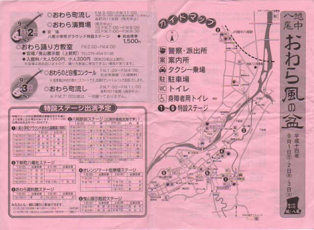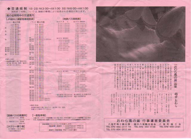 さて、そこからおわら風の盆の行われている越中八尾へ行くには正面改札口から入るしかないとかで通過。時刻表では行きも帰りもあまり遅い時間は無いんだけどこの3日間だけは臨時列車を出していて行くのも帰るのも遅いのがあるらしい。17:45発18:08着(高校生がやたら目立った)。以前歩いたことのある道をぶらぶらと歩く。でも、前来たときは祭りの後だったので閑散としていたのに比べてなんとまぁ人の多いこと。違うところみたい。だんだん陽も暮れてきていい感じ。お祭り自体は7時から始まるので道の両端でみんな場所取り。町ごとに三々五々流しが始まる。一番端っこの東新町でぼーっと待っていたんだけど、ここは踊りがなく男性の地方(楽器のみ)だったので、順繰りに駅へ戻りつつ違う町の踊りを見て歩く。とにかくものすごい人混みで、駅へ向かうのも大変。そんな中、旗を立ててまだ続々とやってくる団体さん達。予定通りの列車で帰ることにして、駅へ着いてみれば改札前にはロープが張られてずらりと人が並ばされていました。幸い、乗るつもりだった列車の一つ前の臨時列車に乗って、富山駅到着。もう、すっかり静かになっている富山駅前を眺めてから、金沢へ。