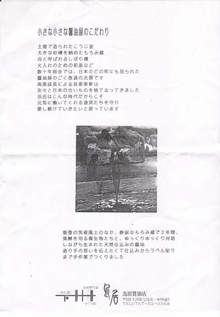 フィッシャーマンズワーフは能登湾を望む位置にあったのでそこから、ジグザグにとりやさい鍋の店、のとやへ。なかなか感じのいい町並みを歩いていたらお醤油屋さん発見!さすがに一升瓶は持って帰れないので、小瓶のお醤油とだしつゆを購入。(まだ、だしつゆしか使用してないけどウマイ!)そこから、小丸山公園を越すと線路沿いに出るなと思ったら、なんと本当に山。しかも、もう一つ山があってそこが七尾城趾だった。土地の高低の急激な変化にびっくり。そんなこんなしてたので、5時にはお店に着けそうもない。遅れますって電話を入れつつ、迷って何度も電話を入れてようやく到着。どうやって、知りましたか?と聞かれてしまった。図書館で借りた1998年版のJTBのガイドブックに載っていたので、知ったんだけど残念ながら持参してなかったので、詳しく答えられず。後から電話でちうたんが連絡してました。ごちそうさま。お肉以外は自家製とのこと。どうりで、安い(550円)。量もたっぷり。そしてウマイ!しかも、鍋をすっかり食べ終わった頃にうどん入れても美味しいんですよ〜なぁんて言われて、じゃ、じゃうどんお願いします!あっ、でもつゆがない!もう一人前鶏野菜を!なんて注文してたら、最初に出していただいたやはり自家製のお漬け物とうどんをサービスして頂いてしまった。本当に、どうも有り難うございました。美味しかったです!帰りの列車の時間が迫っていたのであたふたと駅に戻ったけど、駅前のダイワの中に入っているスーパーでとりやさい鍋用の味噌を購入。お家でも早速白菜とタマネギとにんじんと鶏でとりやさい鍋食べました。やみつき!